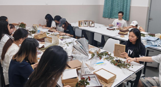 同时,学院开展了“感恩有你,与爱同行”教师节主题干花相框手工制作活动。30余名学生代表齐聚一堂,以手作之心,献感恩之情。活动现场气氛温馨。同学们以原木相框为底,以各式干花为材,充分发挥想象力与创造力,精心设计并制作出一份份独一无二的礼物。他们细心调整花材的位置,巧妙构思色彩的搭配,将寓意无私奉献的雏菊、“永恒铭记”的勿忘我、“累累硕果”的莲蓬等花材精心组合,每一处细节都凝聚着对老师深深的祝福。