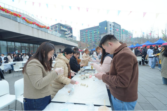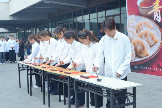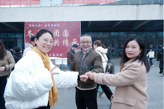 现场还设置了“共劳作·暖团圆”“寻雅韵·承非遗”“纳福运·乐收官”三大体验篇章。师生们齐聚一堂,亲手包饺子、抄手,和馅、擀皮、包捏,在劳动中体会团圆滋味;在扎染、写对联、剪窗花、艾灸、品养生茶等多项非遗与传统养生体验中,近距离感受中华文化的独特魅力;投壶、猜谜等民俗互动游戏则带来了阵阵欢声笑语。活动尾声的抽奖环节,幸运师生获得“冬至福礼”,将活动气氛推向高潮。