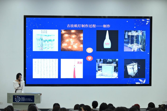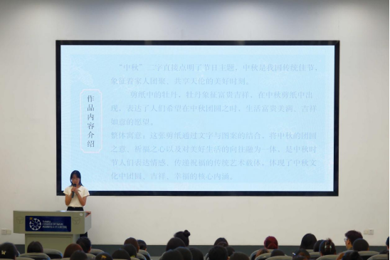 决赛现场,选手们依次手持作品登台,从创作灵感、制作细节到文化内涵娓娓道来。他们的讲述既有对传统中秋元素的当代演绎,也有对团圆情感的细腻表达,展现出深厚的文化理解与艺术巧思。一位同学以环保材料复原古法灯笼,在传承技艺的同时融入现代设计理念,造型别致,意蕴悠长;另一位同学则通过精心绘制的手抄报,将“嫦娥奔月”“玉兔捣药”等经典传说以图文并茂的形式重新演绎,画面生动,故事感十足;还有同学运用黏土塑造出玉兔、明月与桂花树组成的中秋微景,搭配自制灯光底座,在光影交错间营造出静谧而温馨的节日氛围,引人入胜。