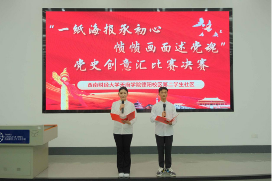 11月11日,西南财经大学天府学院德阳校区第二学生社区“一纸海报承初心,帧帧画面述党魂”党史创意汇比赛决赛在B101教室圆满落幕。决赛邀请了康养护理学院学生党建办公室指导老师陈心悦、郑仁敏以及辅导员代表王翰麟担任评委。