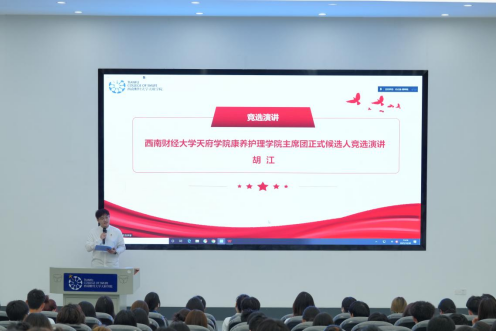 在竞选演讲中,五位候选人围绕工作理念与未来规划展开阐述。徐柯鑫提出“以创新为帆,办有品质的活动;以团结为魂,建有力量的队伍”;曾佳欣强调优化内部机制,打造服务型团队;李嘉瑞主张‘内强基础、外拓维度’,提出通过建立月度需求调研机制、简化日常事务流程等方式提升同学获得感,从而全面提升团学品牌影响力;胡江着眼于激发团队活力,提议通过“以老带新+任务轮换制”强化队伍建设,并利用“头脑风暴+兴趣能力分配”机制保障全员参与。张慧慧提出“三个聚焦”工作法,致力于让学代会更有温度、力度与深度。五位候选人的演讲展现了康养学子勇于担当、锐意进取的精神风貌。