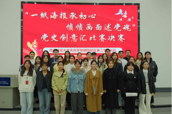 11月11日,西南财经大学天府学院德阳校区第二学生社区“一纸海报承初心,帧帧画面述党魂”党史创意汇比赛决赛在B101教室圆满落幕。决赛邀请了康养护理学院学生党建办公室指导老师陈心悦、郑仁敏以及辅导员代表王翰麟担任评委。