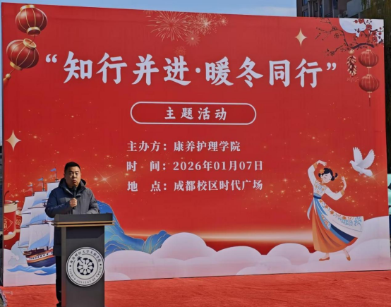 为弘扬中华优秀传统文化,搭建学生实践平台,康养护理学院于2026年1月7日下午14:00-17:00在成都校区(东区)时代广场举办“知行并进·暖冬同行”主题活动。学校机关分党委书记、就业指导中心主任蔡松伯,康养护理学院分党委副书记任讷、陈雯等嘉宾出席开幕式,教职工代表及广大学生共同参与。